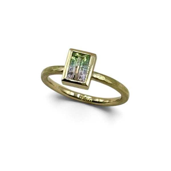 Beschreibung: Dieser wünderschöne zarte Goldring versprüht echte Frühlingsgefühle. Durch die zarten naturtöne von rosa bis grün spiegelt er die Farben des Frühlings wieder. Gefasst in 750 Gelbgold wird der Stein nochmal besonders hervorgehoben und ist trotz der eckigen Form nicht sonderlich dominant. Die Oberfläche der Ringschiene ist mit einem Hammer geschmiedet und die seiten mattiert. So hat der Ring viele Facetten und ist aus jedem Blickwinkel ein echter hingucker.